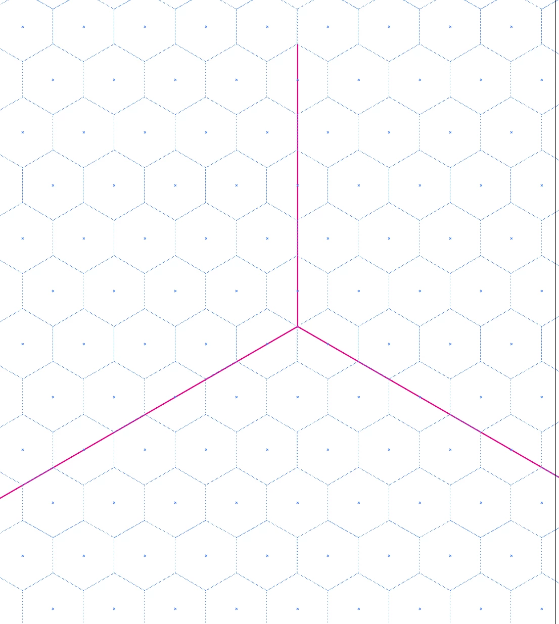 垂線を1本引いて端点基準で120°回転コピーを2回行ってガイドを作成すればOKなんですけど、版面全体を構成するには以下のように六角形を並べてガイドにすると各部の120°が把握しやすくて便利です。