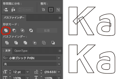 ④1文字ずつ選択して、パスファインダー > 合体