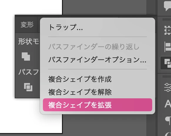 もしも、④のあとに、1文字だけ選択して、パスファインダーパネルのフライアウトメニューで「複合シェイプを拡張」がグレーアウトしていない状態であれば「複合シェイプを拡張」する必要があります。もしくは③の直後まで戻り、④でoptionキー(Windowsならaltキー)を押しながら合体ボタンを押してください。