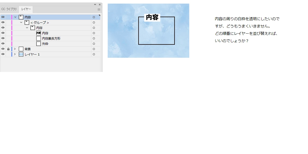 文字列の周りに「内容裏長方形」という、レイヤーを作り、これを透明化して、「内容」だけを背景の全面に持ってきたいのです。
