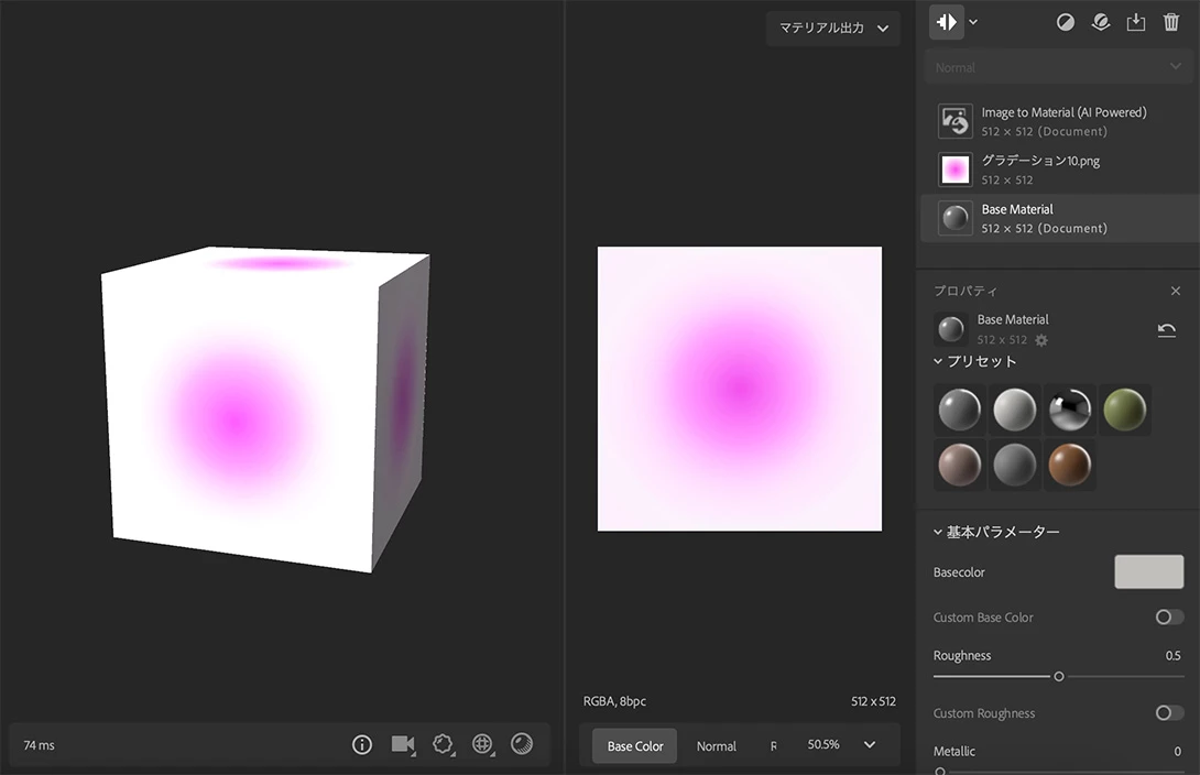 Substance 3D Samplerというソフトを使って、画像をマテリアルに変換すると下図のようにできます。