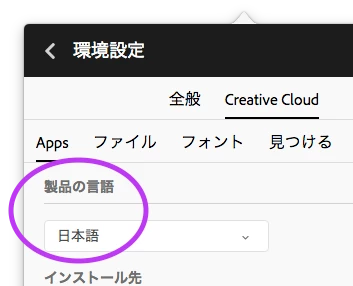 2. CCデスクトップアプリケーションの環境設定で「製品の言語」を「日本語」にする