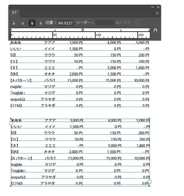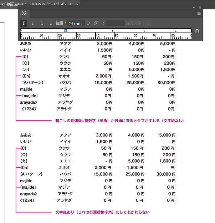 Windows10 AI2024(28.5)でタブを使った表組を作ろうとしたところ、行頭に括弧類でくくった英数字が来ると、その行だけタブが設定値より前にずれるという現象が発生しました。
