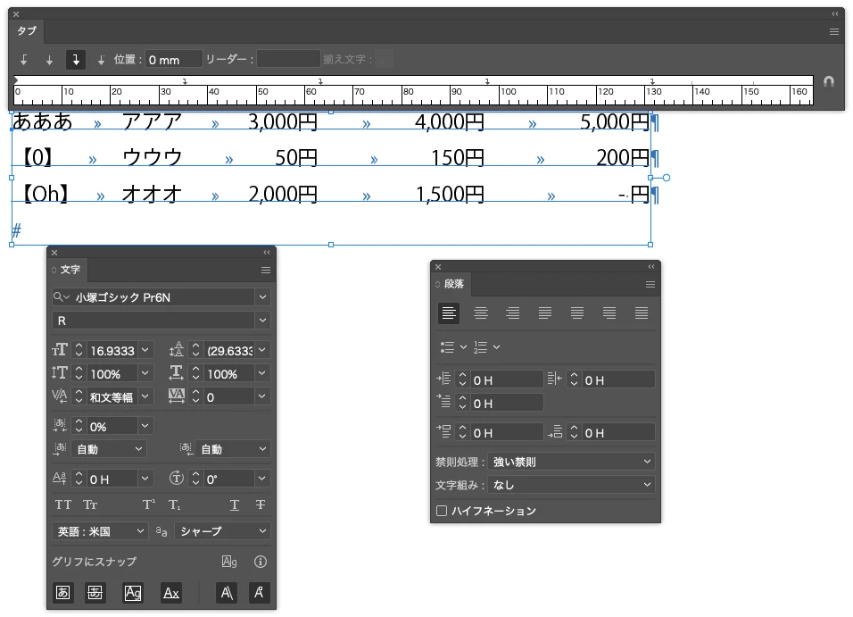 過去に、文字組ありにするとタブが揃わないという現象の記憶があったのでオンオフ試してみましたが、影響ありません。フォントを変更しても変わりませんでした。