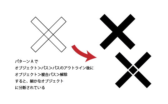 AAnonymousForum|Forum|5 years agoOctober 19, 2020Question複合シェイプ→パスのアウトライン化するとパスファインダーを使う前の元の形に戻ってしまう。Forum|Forum|5 years agoOctober 19, 20204 replies16304 views①図形を線で作成②パスファインダーで合体③線と塗りを逆に④拡張せず、パスのアウトライン化⑤黒の×にならず、元の原型の線幅がアウトライン化された状態に イメージでは黒塗りの×のアウトラインしたものが出来ると思っていました。アウトライン化すると、パスファインダーで合体する前の線がアウトライン化された状態になってしまいます。線で図形を作成、パスファインダー(合体)した後に、塗と線を逆にして→パスのアウトライン化をした際、塗部分だけのアウトライン化は出来ないんでしょうか、、、。分かりにくい説明ですみません、、。 描画とデザイン印刷と公開
