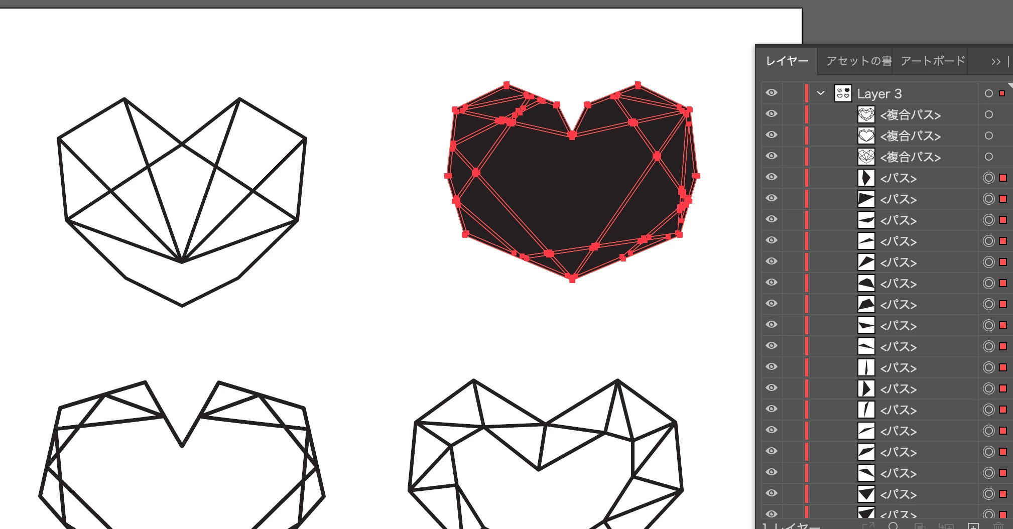 下記写真のハートの線が太すぎるから幅を細くしたいが、複合パスで作成されているため調整できない。パスのオフセットを試してみましたが分かりませんでした。