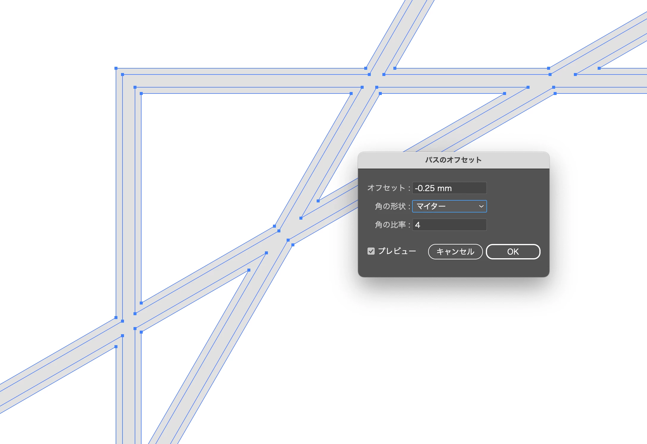 線幅が1mmだとパスのオフセットの数値を-0.25mmにします。複合パスの外と内からオフセットされますから、これで線幅は半分となります。