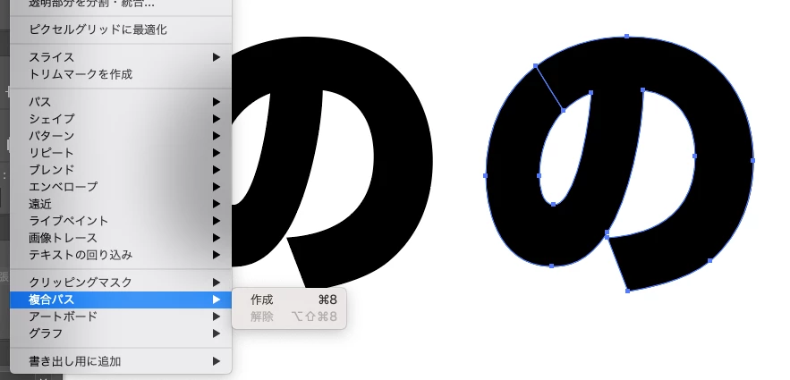 文章を複合パスで編集したあと、単語の個別に色を変える編集をしたいのですが、複合パスを解除すると、添付画像のように「す」や「の」の丸い囲まれた部分が塗りつぶされてしまいます。
