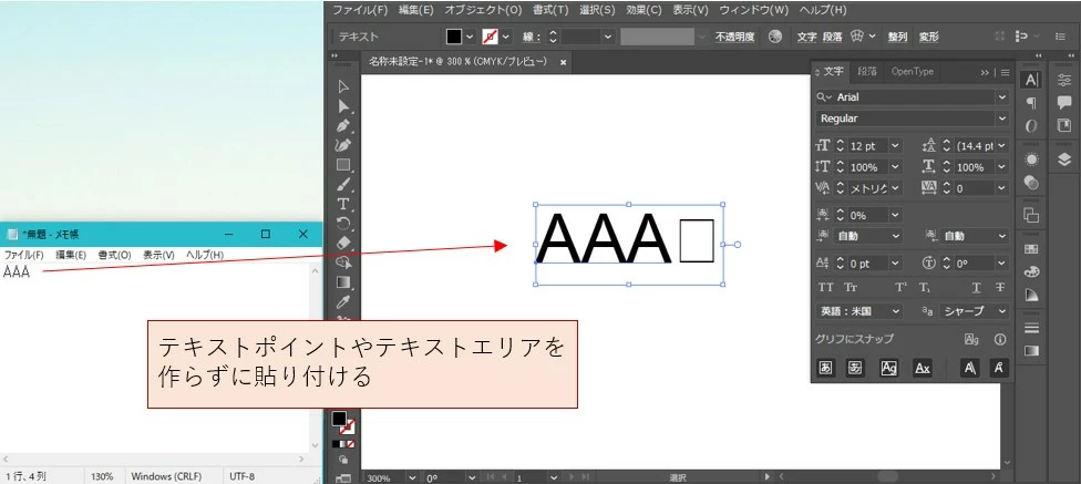メモ帳等にある書式情報の無いテキストをコピーし、Illustratorでテキストポイントやテキストエリアを作らずに貼り付けると、テキストの貼り付け自体はできますが、末尾に“何か”が混入します。
