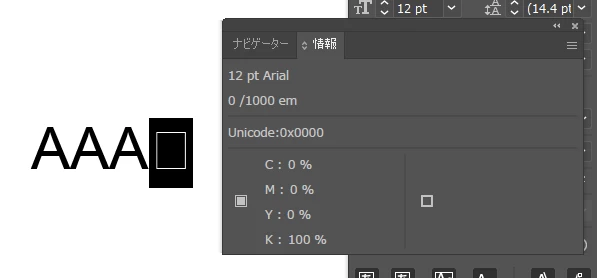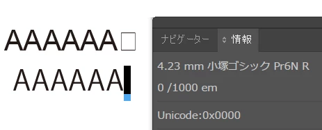 情報パネルを確認してみたところ、「Unicode:0x0000」と表示されます。