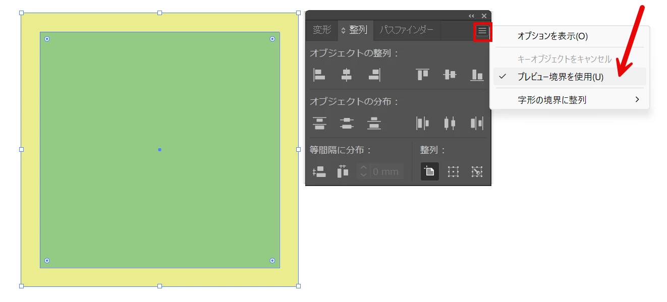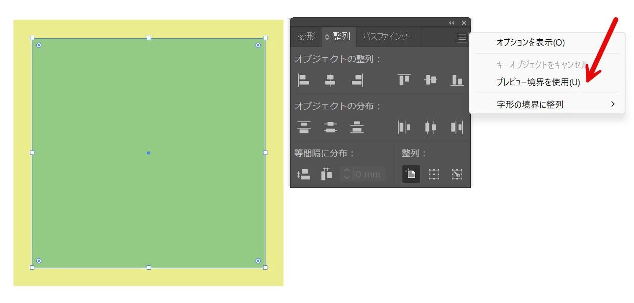 ※「プレビュー境界を使用」は、整列パネルのオプションにあります。
