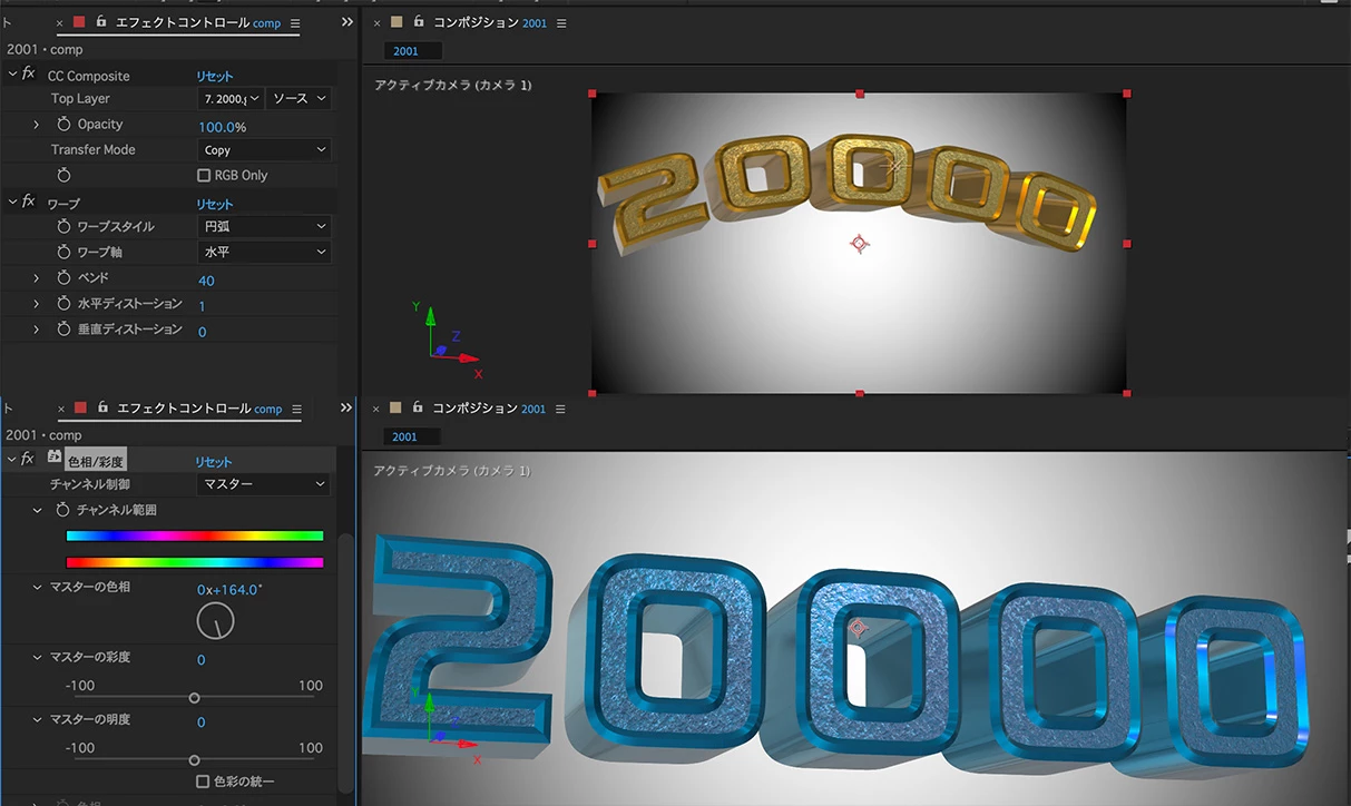 また、今回のテロップは表面の部分、エッジの部分、押し出しの部分の3つに押し出し効果を付けているのでしょうか。 それぞれに押し出しベベルを適要するとテロップの遠近感やX軸?の回転具合を合わせるのに苦労しますが、変形などを使って細かく調整していくしかないのでしょうか。