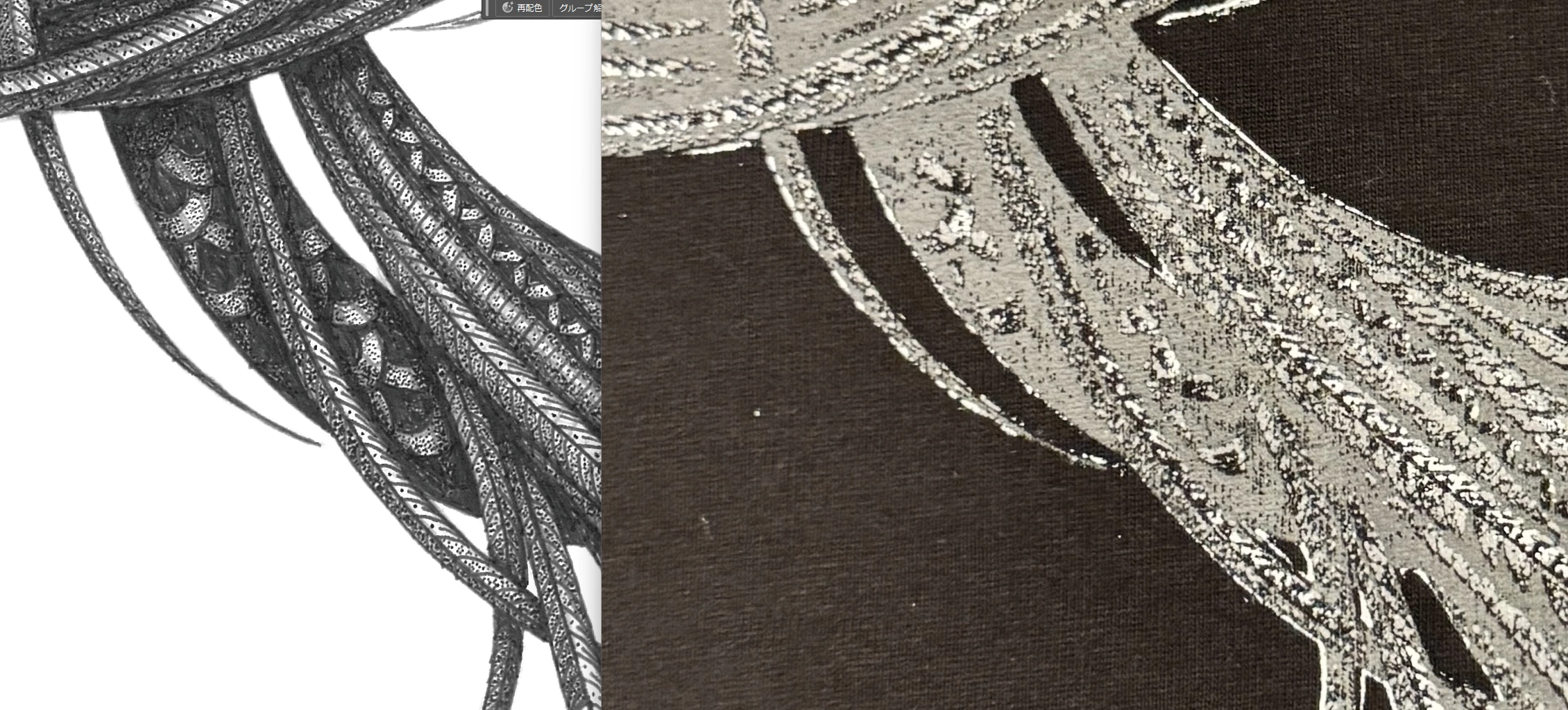 私はデザイナーで、お客様から提供の鉛筆の細かい点描画を使用してプリント図案を作成し納品しました。