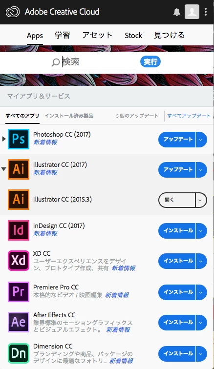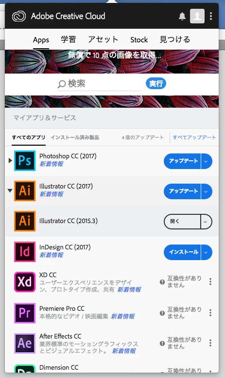 Adobe Creative Cloudの「アップデート」ボタンが押せるようになっていますが、