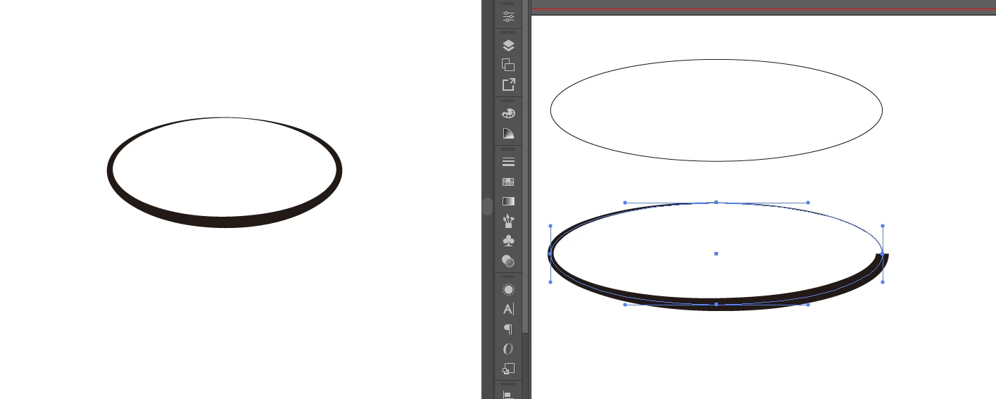 Windows10でCreativeCloudを使用。Illustratorの複数バージョンを併用していますが、2023で楕円に線幅ツールを使ったところ、図の右側ような状態に。これまでは左側の状態になっていたのですが……(今回は検証のために2024で操作をしたら思う通りの形になりました)。