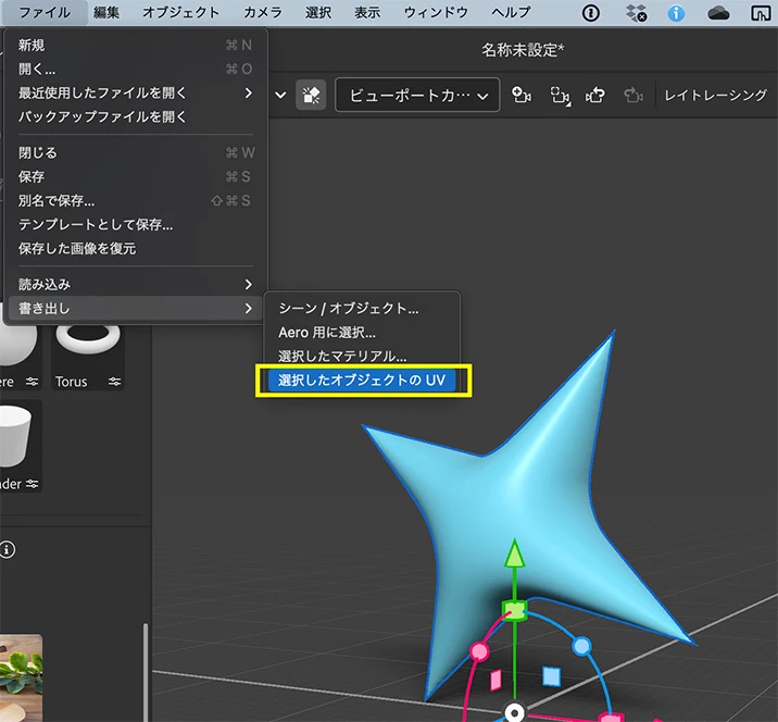 DimensionでGLTFを開いてから、「選択したオブジェクトのUV」を選んでUVマップをPSD形式で書き出します。