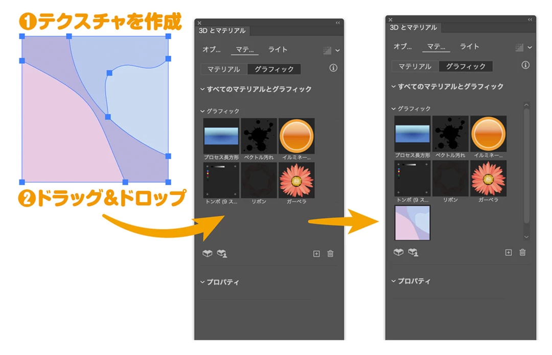 Adobe Dimensionが使用できるプランを契約されている場合は、下記の方法で3Dモデルのテクスチャーとして画像を貼り付けることができます。