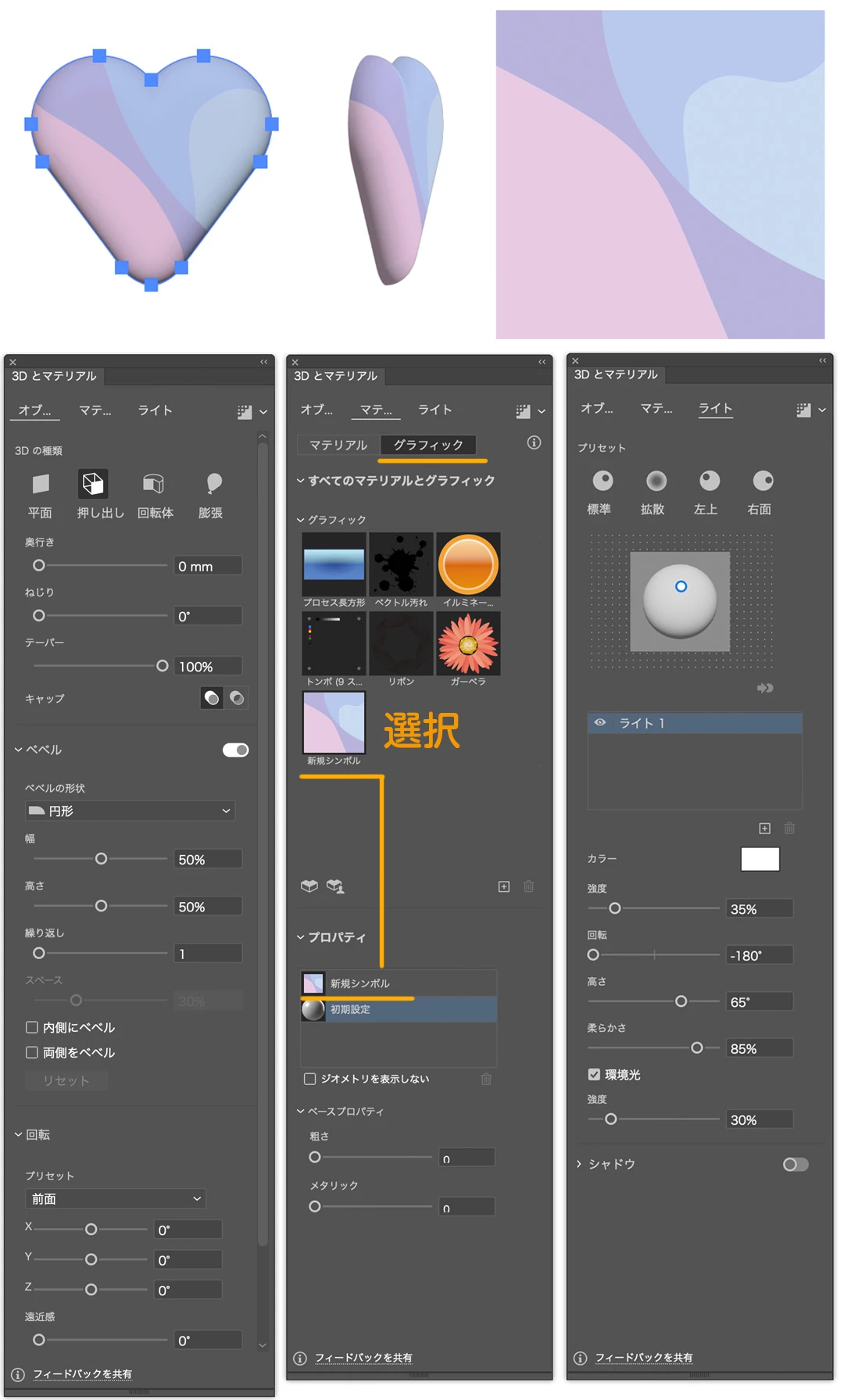 詳しくはAdobeさんサイトのIllustratorユーザーガイド「3D オブジェクトへのアートワークのマッピング」をお読みください。