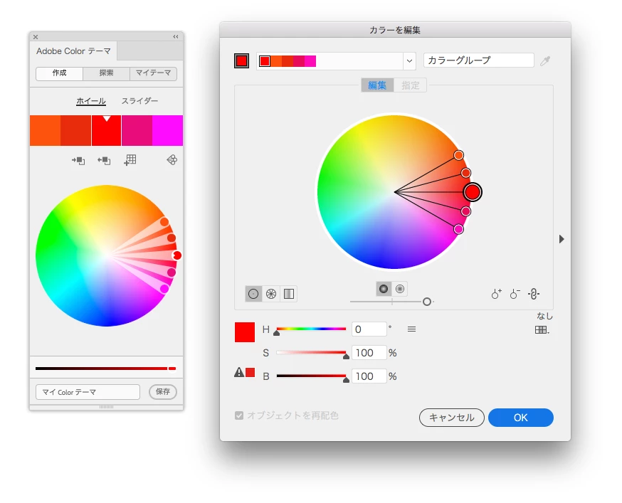 ところで、カラーガイドパネルのメニューから「カラーを編集」を開くと似たダイアログが表示されます。