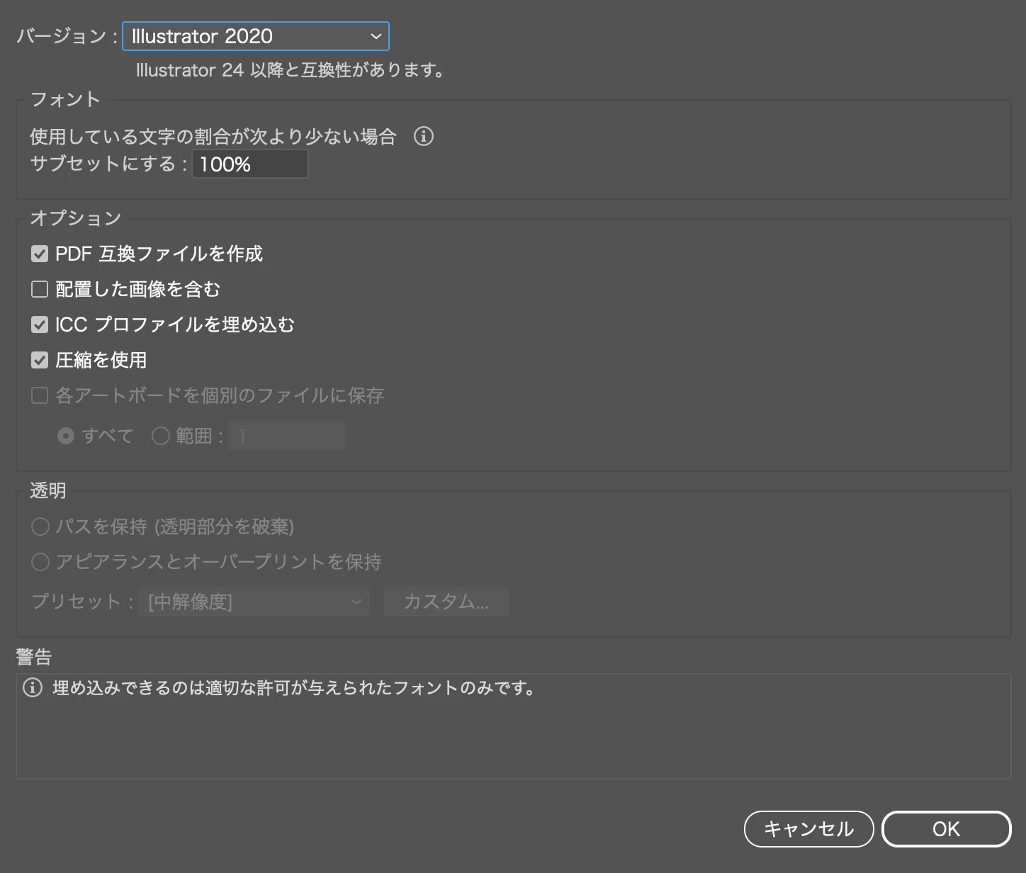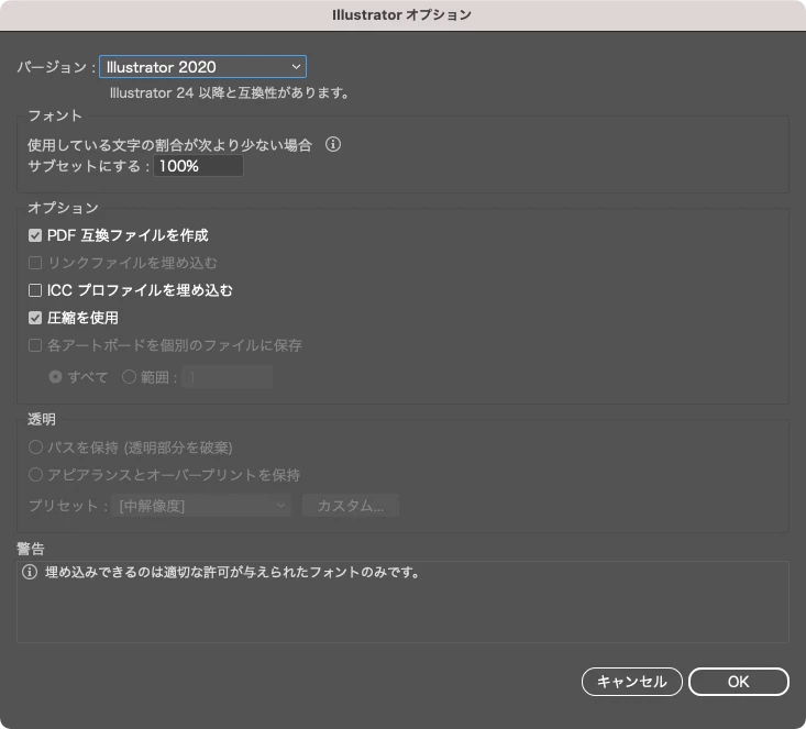 参考までに、ai形式で保存する際のオプションはどのような状態になっていますか?
