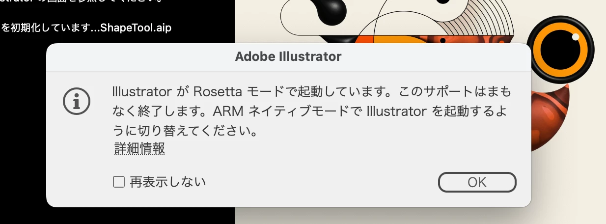 イラストレーターを立ち上げると「IllustratorがRosettaモードで起動しています。このサポートはまもなく終了します。ARMネイティブモードでIllustratorを起動するように切り替えてください。」と出てきます。