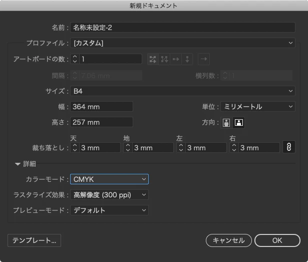 1.新規ドキュメント作成。サイズはこの時点でA3横にしてもいいですが、あとで変えられます。
