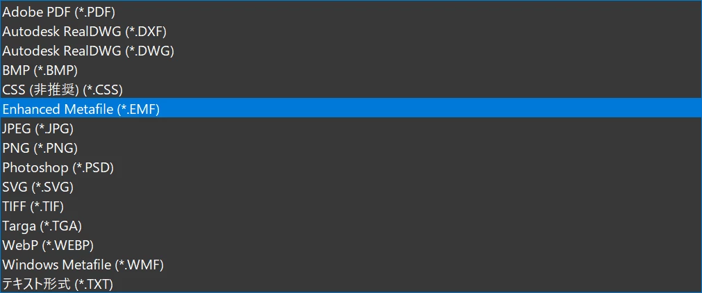 Kken_pmp_view5157ParticipantForum|Forum|1 year agoJanuary 3, 2025질문EMF形式で書き出しができないForum|Forum|1 year agoJanuary 3, 20252 답변들1162 조회作成済みのロゴをPowerPointで使用するため、EMF形式で書き出したいのですが、Illustratorの書き出し形式にEMF形式が含まれておらず困っています。ご教示いただけますか。Illustrator初級のカジュアル利用者です。以前(数年前)にはEMF形式も書き出しが可能でしたし、現在のヘルプ情報でも仕様的に変更されていないように見えます。環境設定での書き出し形式変更も探してみましたが見当たりませんでした。使用バージョンは29.1、28.7、OSはWindows11、MacOS 13.7、14.7。iPad版も試してみましたが、同じ状況です。手順・操作方法読み込みと書き出し
