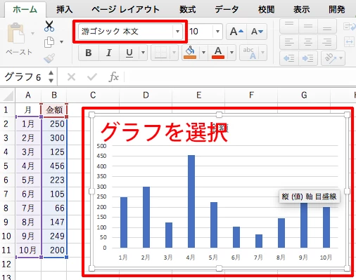 Excelでグラフを選択、ホームタブでフォントを変更する