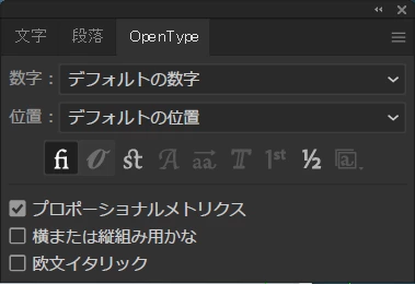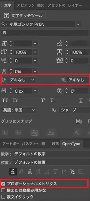 OpenTypeのタブでもプロポーショナルメトリクスを選ぶ項目がありません。image02