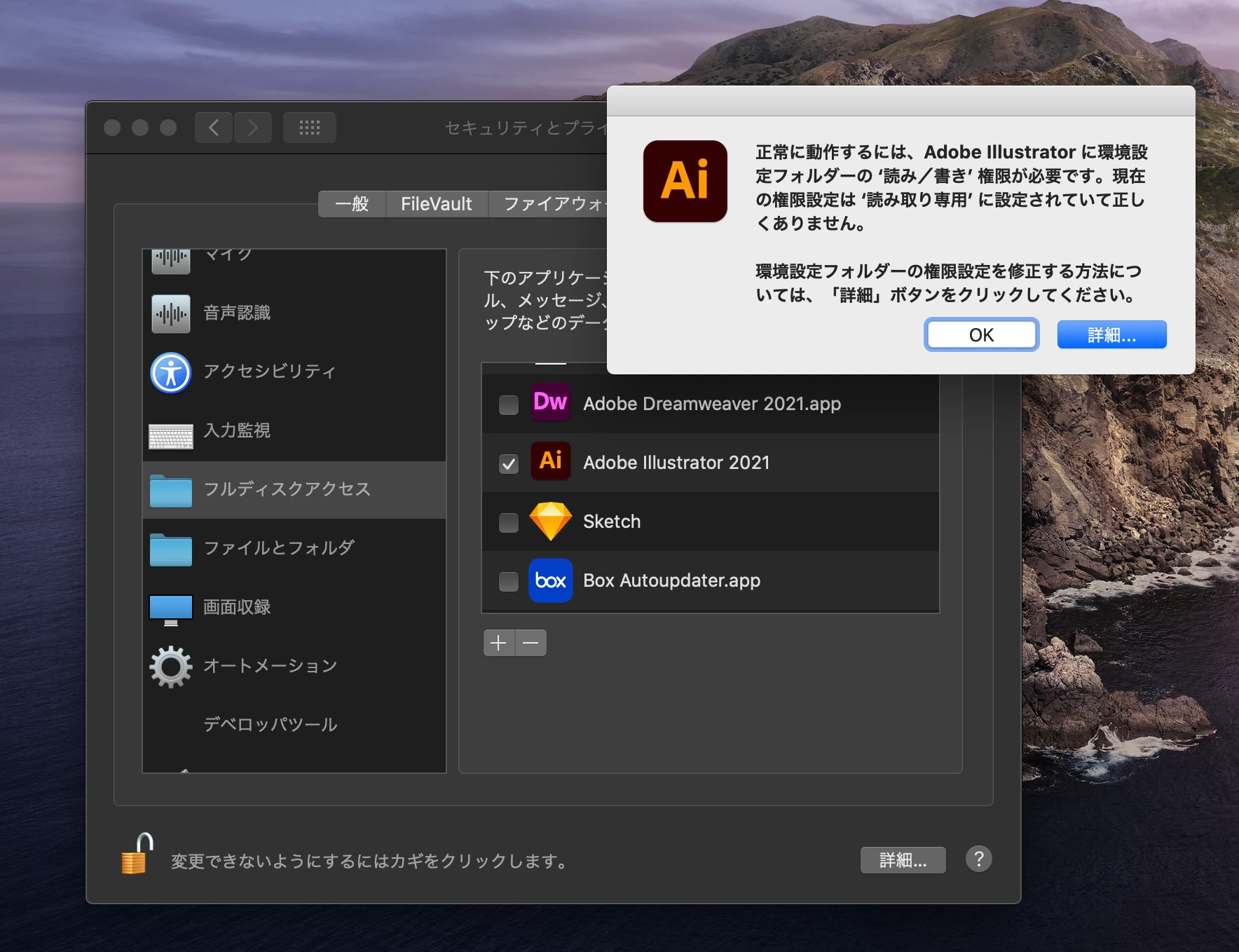 アドバイスいただいたように、プライバシー設定のフルディスクアクセスにIllustrator2021を追加して、起動を試みましたが、添付右と同様のエラーが発生しました。。。。