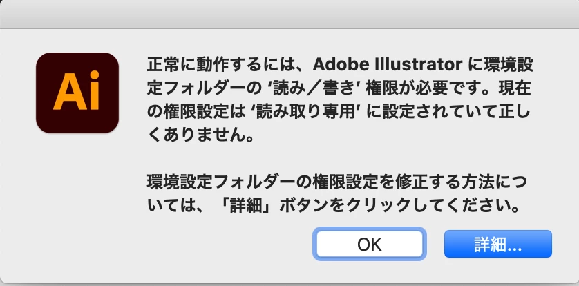 illusrator 2021 v25.0をインストールしたら起動しなくなりました。エラー内容「環境設定フォルダに読み/書きの権限が必要です。」