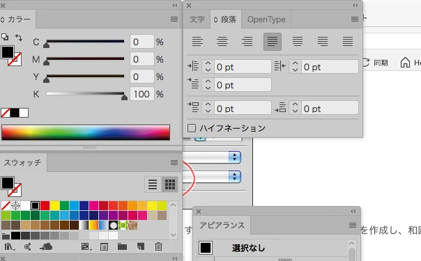 本来は段落パネルのオプションメニューに出てくるのですが、その段落パネルの状態だと、