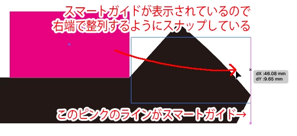 これを確認するには、メニューの「表示」から「スマートガイド」のチェックを外して同様の動作をしてみてください。