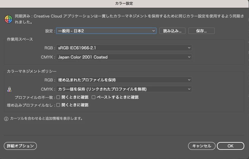 差し支えなければIllustratorの編集メニュー  >  カラー設定 のスクリーンショットを貼ってもらえますか?