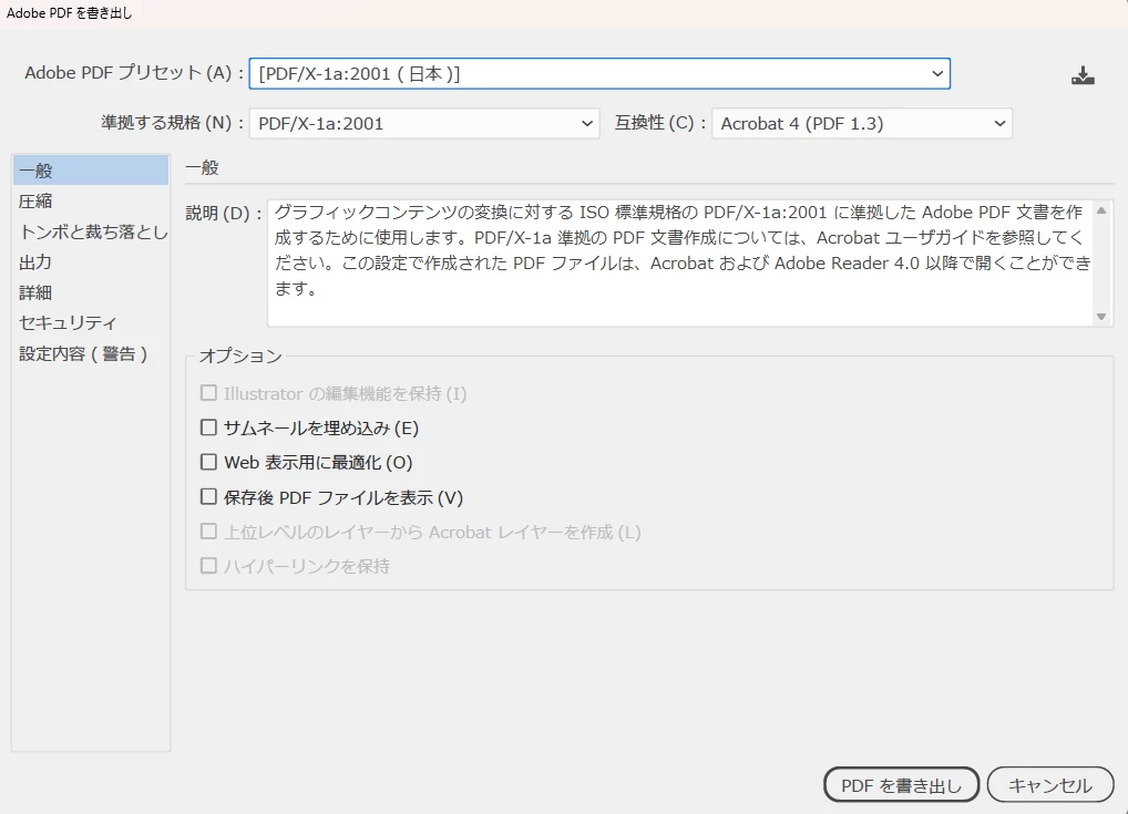 「PDF出力」は保存か書き出しだと思いますが,そのときのAdobe PDF プリセットは何ですか?