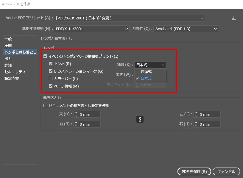 IllustratorでPDFの書き出しの際のトンボの設定についてお尋ねします。
