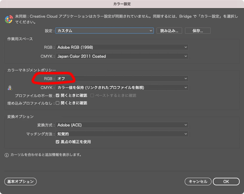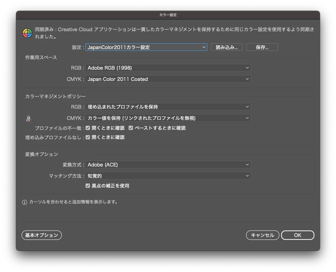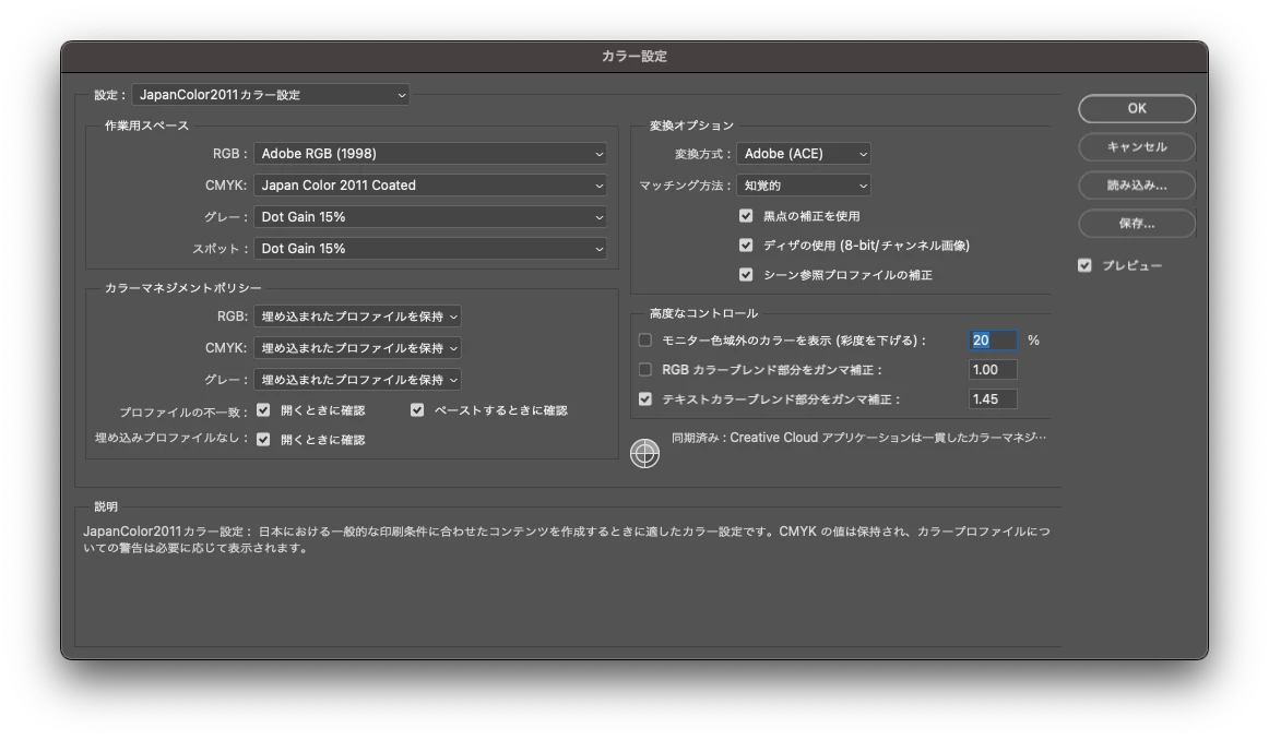 カラー設定は、AdobeCCすべてで共通で次の通り(Bridgeでカラー設定を統一している):