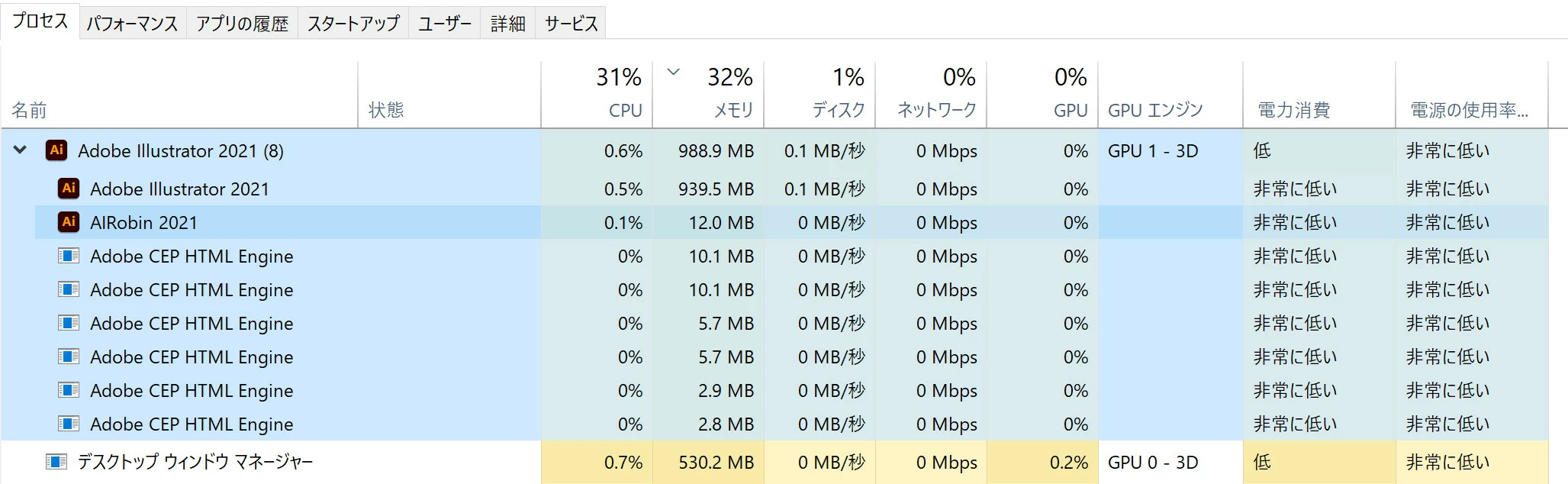 Illustrator起動中のタスクマネージャーのSSをアップいたします。