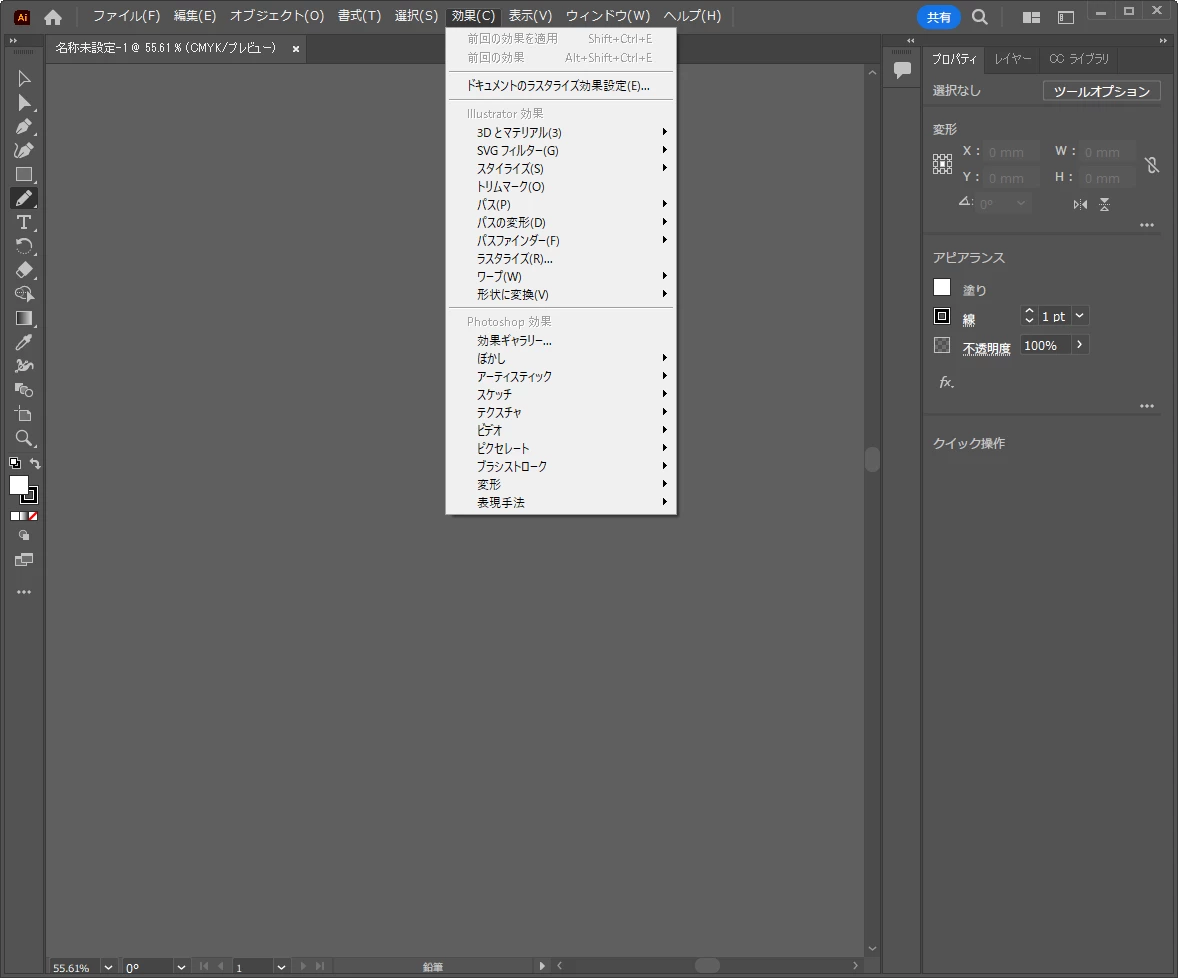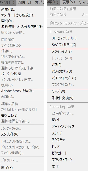 Illustratorのメニューバーの中で、一つのメニューの中身が大きい文字で表示されます。