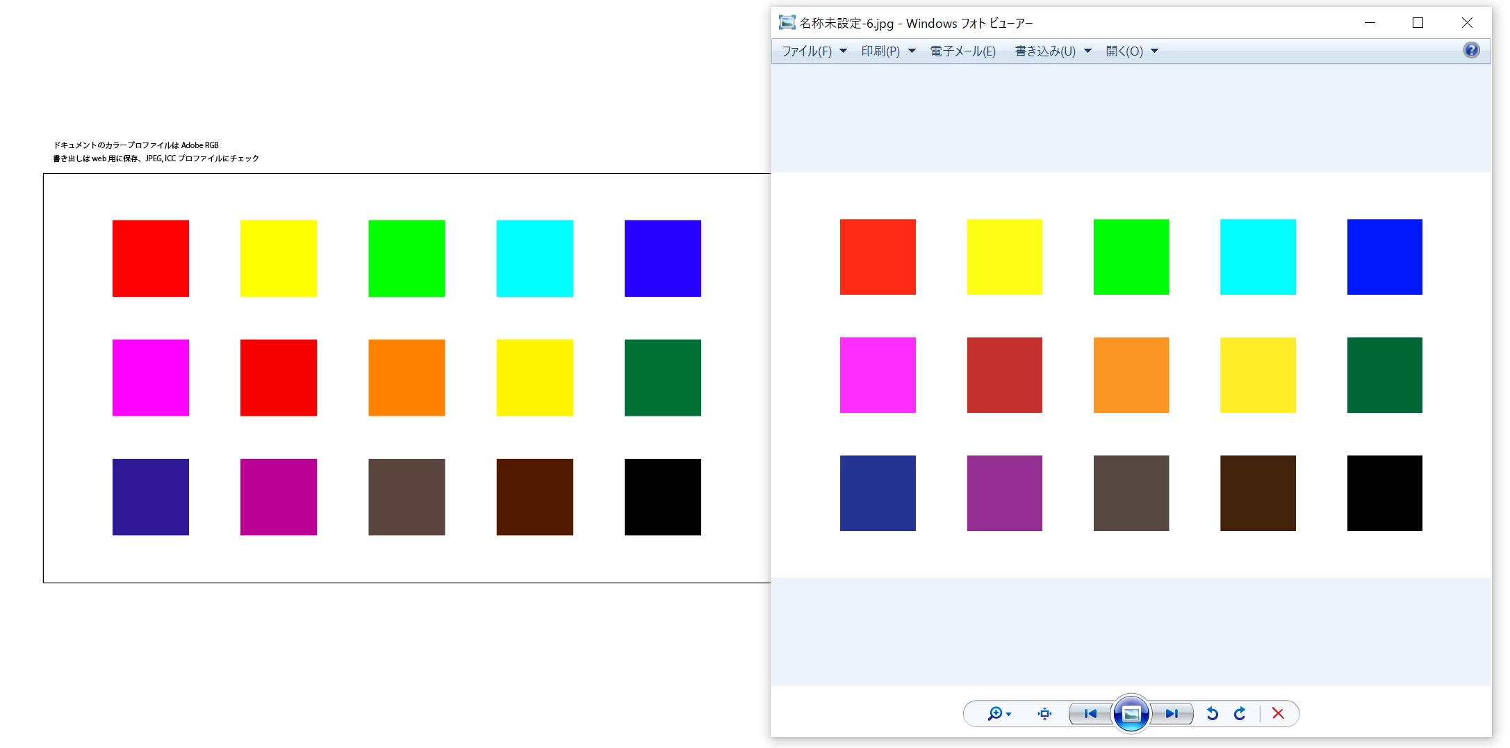以下の画像は、カラーモードをCMYKで作成したドキュメントと、それを書き出した画像を並べたものです。カラー設定はプリプレス用 - 日本2、カラープロファイルはJapan Color 2001 Coated. 書き出しはweb用に保存で行い、JPEG最高画質でsRGB変換にチェックを付けています。