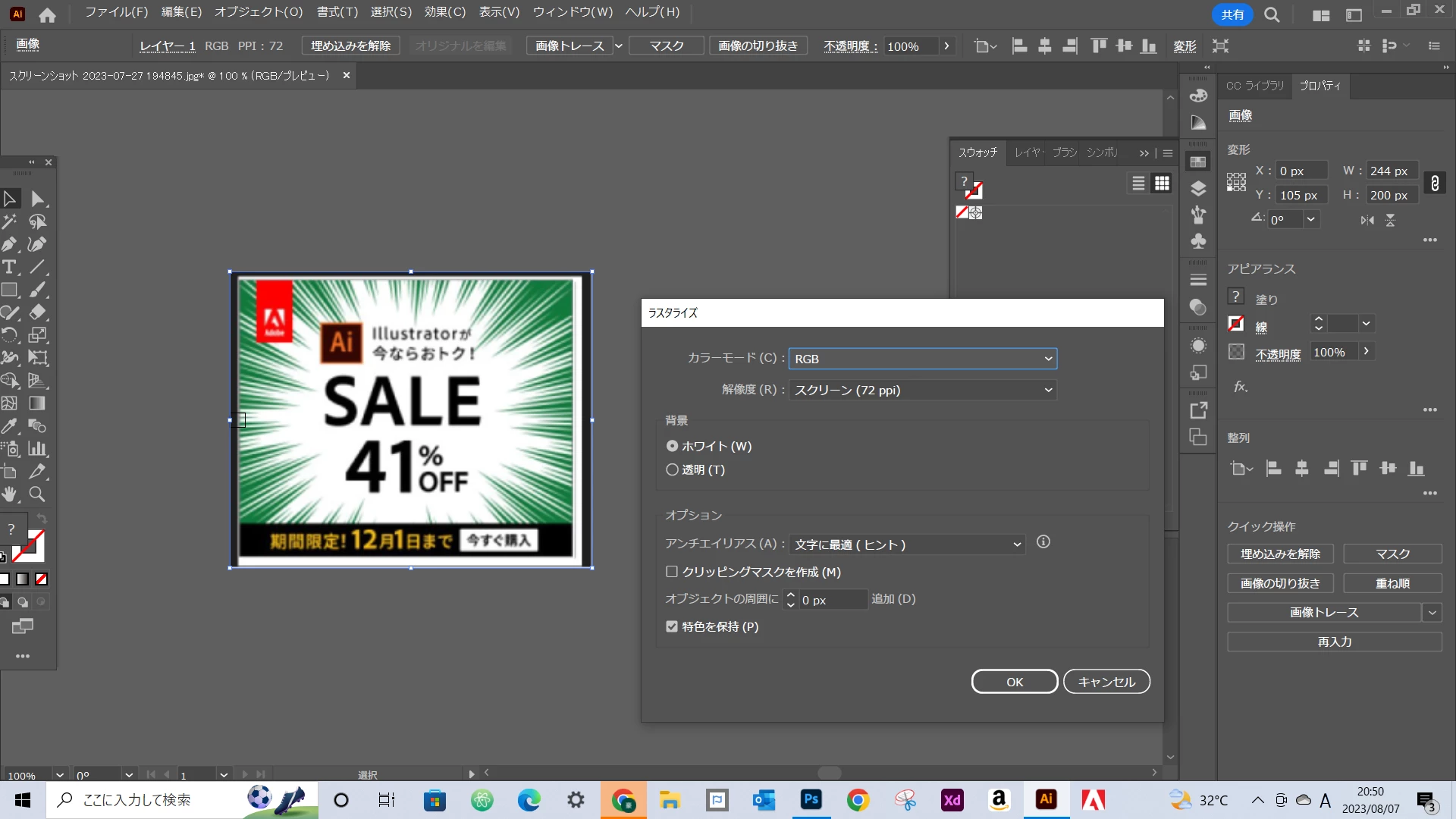 illustratorでオブジェクト→ラスタライズ