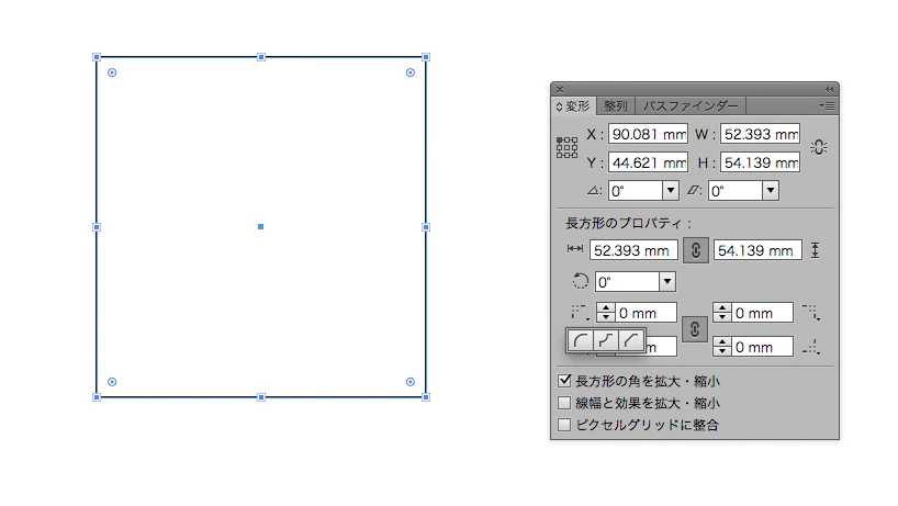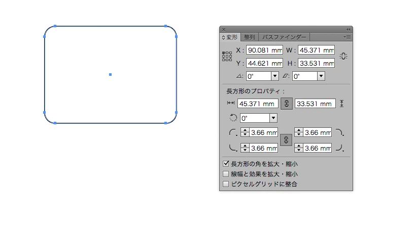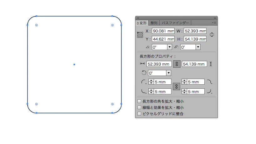 「変形」パネルの「長方形のプロパティ」を設定します。