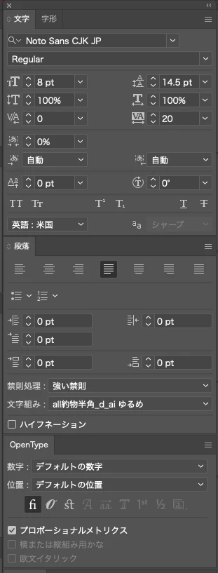 文字組み情報はパレットのキャプチャを添付します。