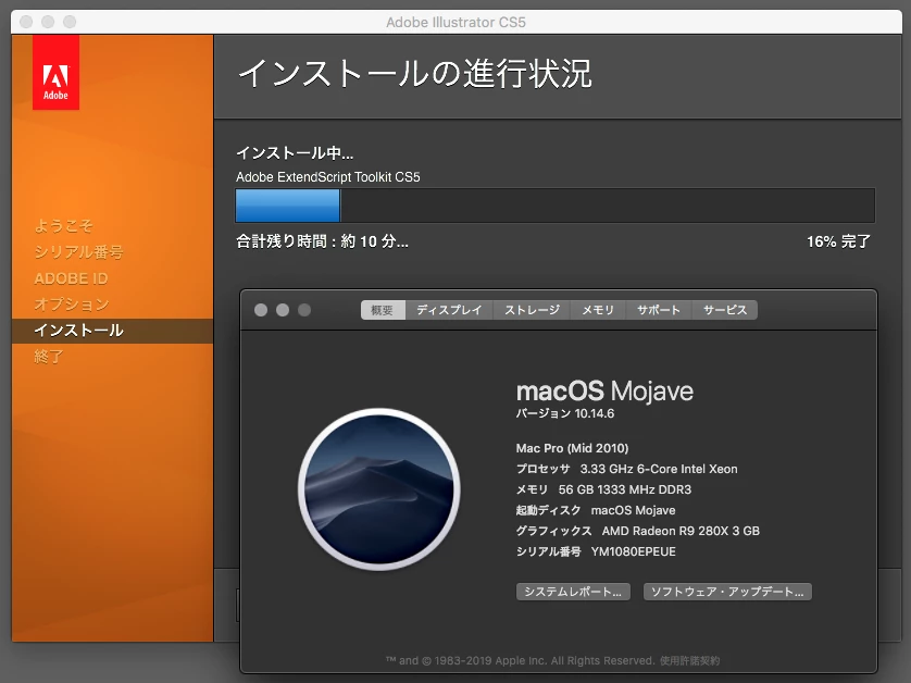 お聞きします、I-MAC 10.14.6 なのですが Illustrator CS5を インストールしようとすると   ”Install"を開ません。 ディスクイメージを取りだす必要があります。 となり、 スムーズにインストールできません。 そして ディスクイメージを取りだすという所をクリックし もう一度やっても同じ事になります。 CS5が古いバージョンで 新しいI-MAC に対応が100%でなないようなのですが 何かうまくCS5 をダウンロードする方法はないのでしょうか?? それとも バージョンが古くて合わず 使えないのでしょうか??  システム環境設定の セキュリティーとプライバシーは App Store と確認済の開発元からのアプリケーションを許可にマーキングしてあります。 すみませんが どなたか詳しい方 よろしくお願いいたします。