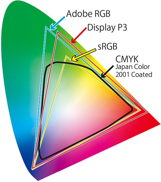 両方に関わるのでこの図を見て下さい。これは、Adobe RGB/sRGB/CMYK(2001)それぞれが、どれくらいの鮮やかさの色を再現できるのか、を平面図にしたものです。大きいほど、鮮やかな色を表現できます