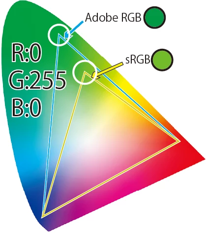 sRGBのG255は黄緑ですし、Adobe RGBのG255は濃緑です。