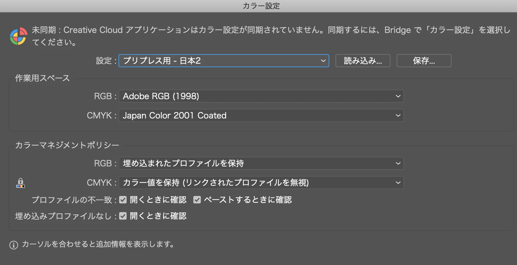 提示されているカラー設定は、RGB作業用スペースはAdobe RGBでした。