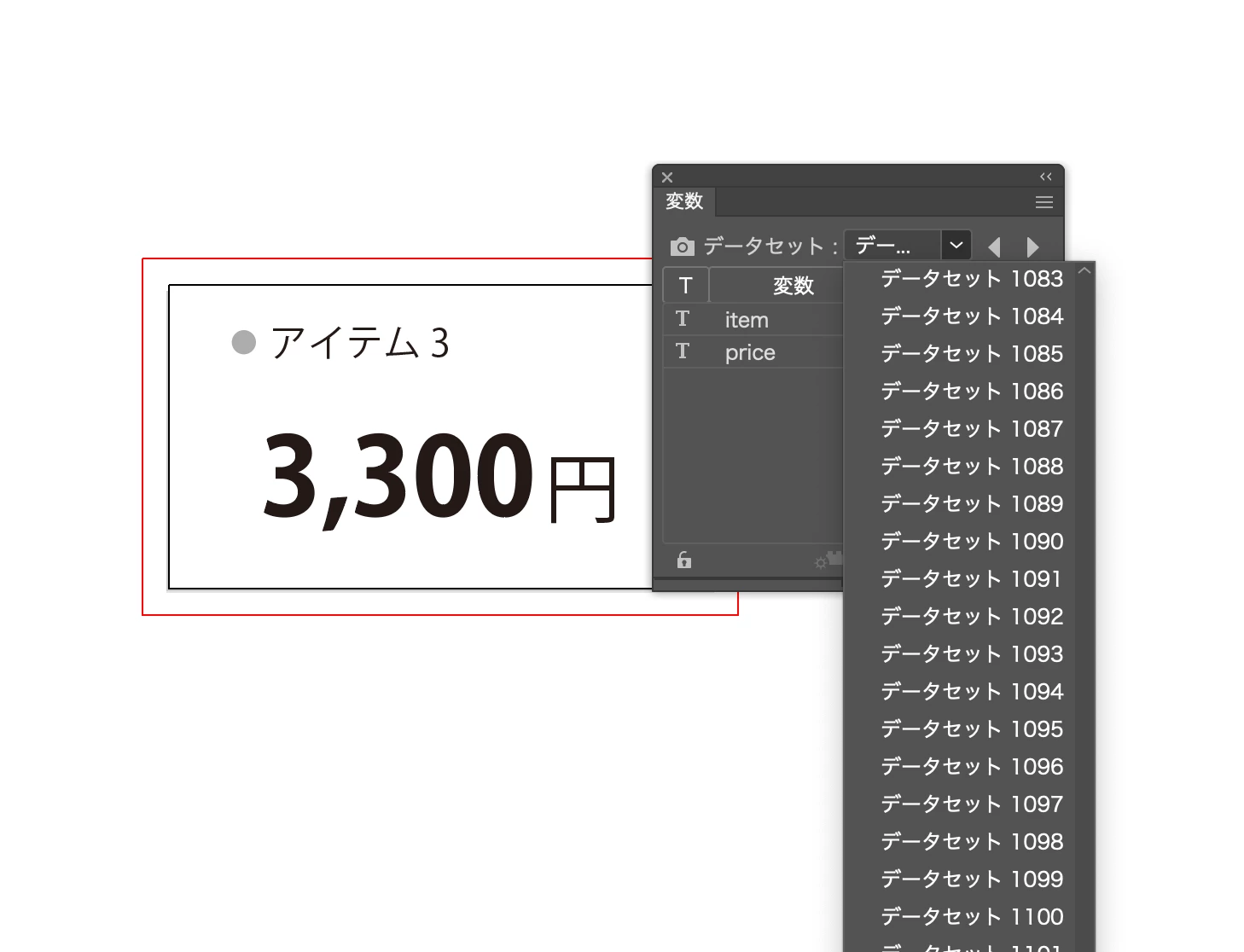 1:illustratorでテキストを配置、「変数」パネルでCSVを読み込む。