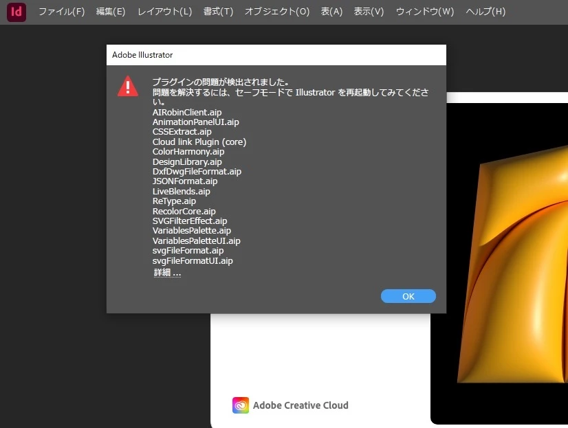 Kkeiichirou31091924hzs3ParticipantForum|Forum|2 years agoJuly 15, 2023QuestionIllustrator2023(27.7)「プラグインの問題が検出されました」Forum|Forum|2 years agoJuly 15, 20231 reply1125 viewsインストールをしたのですが、起動時に「プラグインの問題が検出されました。プラグインの問題を解決するには、セーフモードでIllustratorを再起動してみてください。」というメッセージとAIRobinclient.aip、animationpanelUI.aip、cloud link plugin(core)など12個くらいの名称が出てきていて、再インストールなど試したのですが改善しません。なにか対応などご存じの方いらしたらよろしくお願いします。手順・操作方法Win