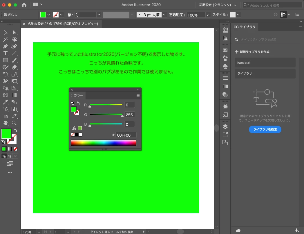 CPUプレビューにすると見慣れた正しい色味に表示されるのですが、過去Illustratorを使ってきてGPU/CPUプレビューで色味が変わるということはありませんでした。
